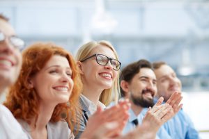 Photo of happy business people applauding at conference, focus on smiling blonde